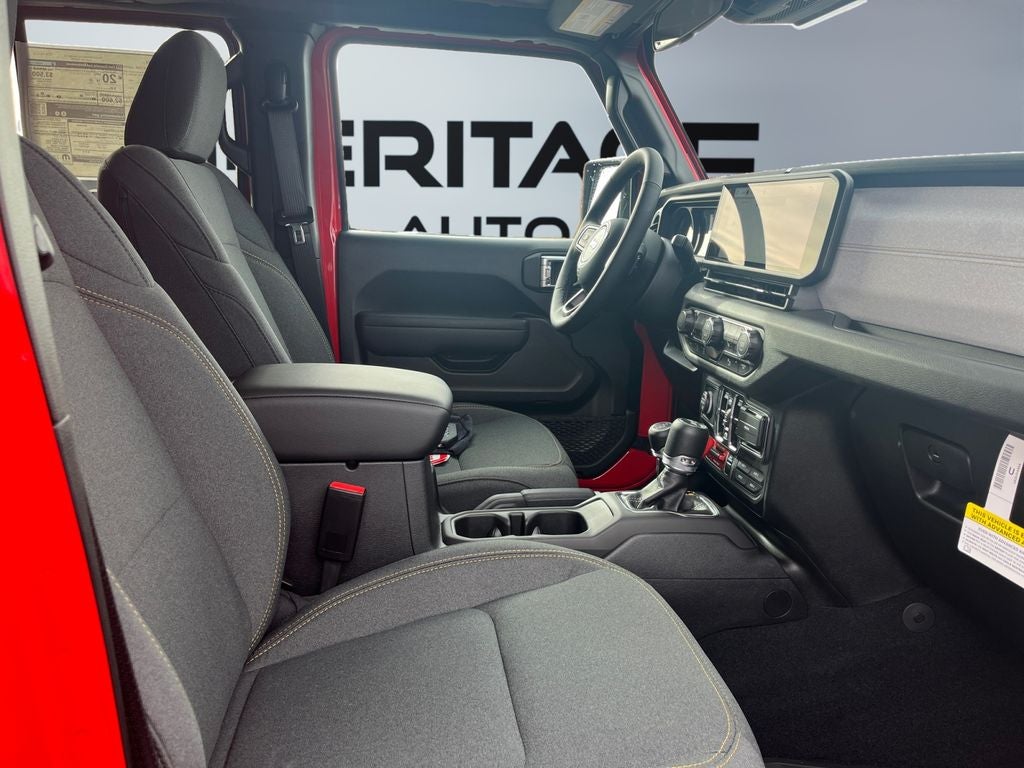 See what's behind you with the back up camera on this model. It's Forward Collision Warning feature alerts drivers to potential front-end collisions. Apple CarPlay: Seamless smartphone integration for this unit - stay connected and entertained on the go! The vehicle comes equipped with Android Auto for seamless smartphone integration on the road. Start this mid-size suv from inside with remote start. This mid-size suv keeps you comfortable with Auto Climate. An off-road package is installed on this unit so you are ready for your four-wheeling best. The state of the art park assist system will guide you easily into any spot. This vehicle is pure luxury with a heated steering wheel. This vehicle has automated speed control that adjusts to maintain a safe following distance, enhancing highway driving convenience. It features a hands-free Bluetooth® phone system. Maintaining a stable interior temperature in this 2025 Jeep Wrangler is easy with the climate control system.