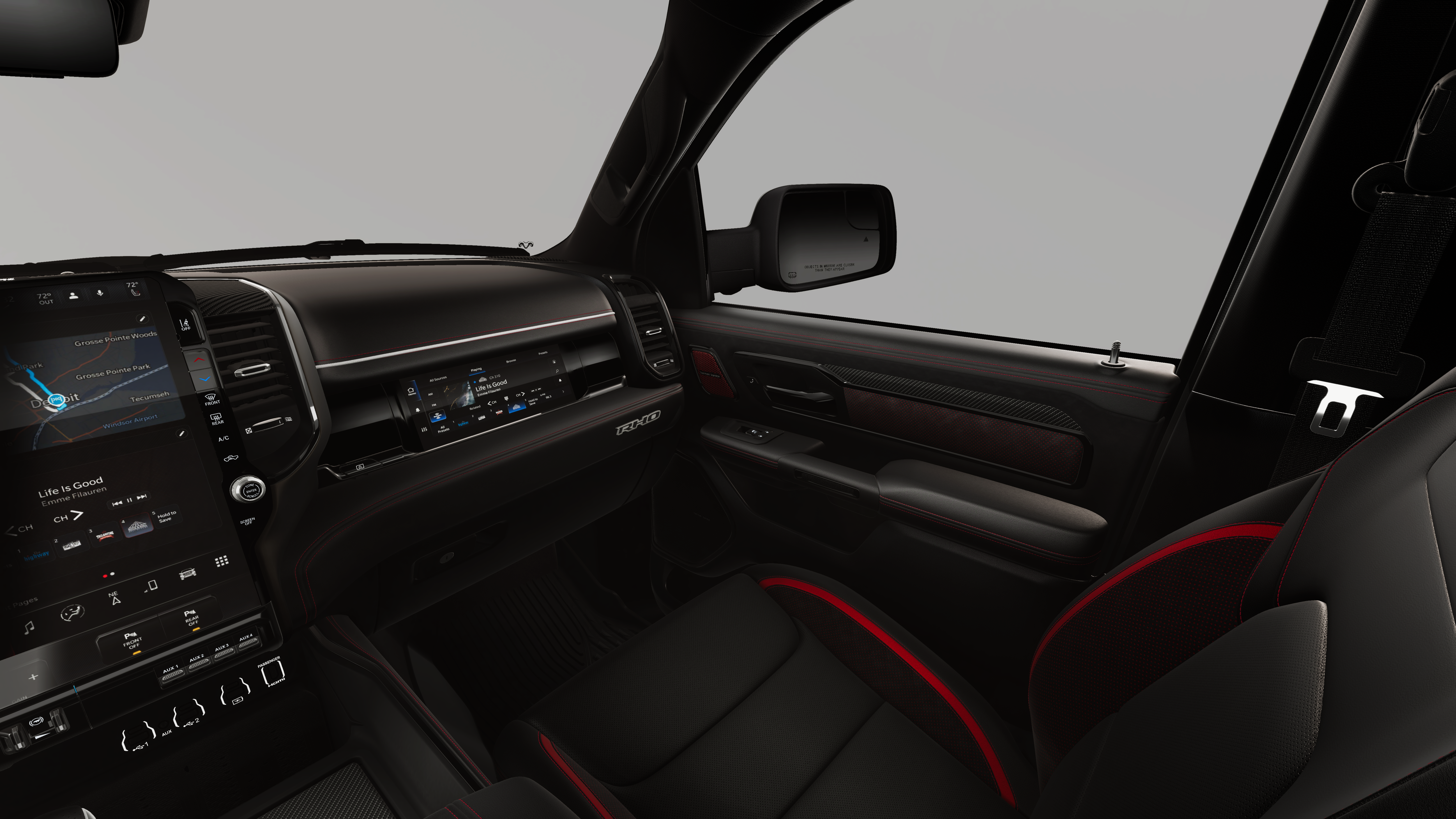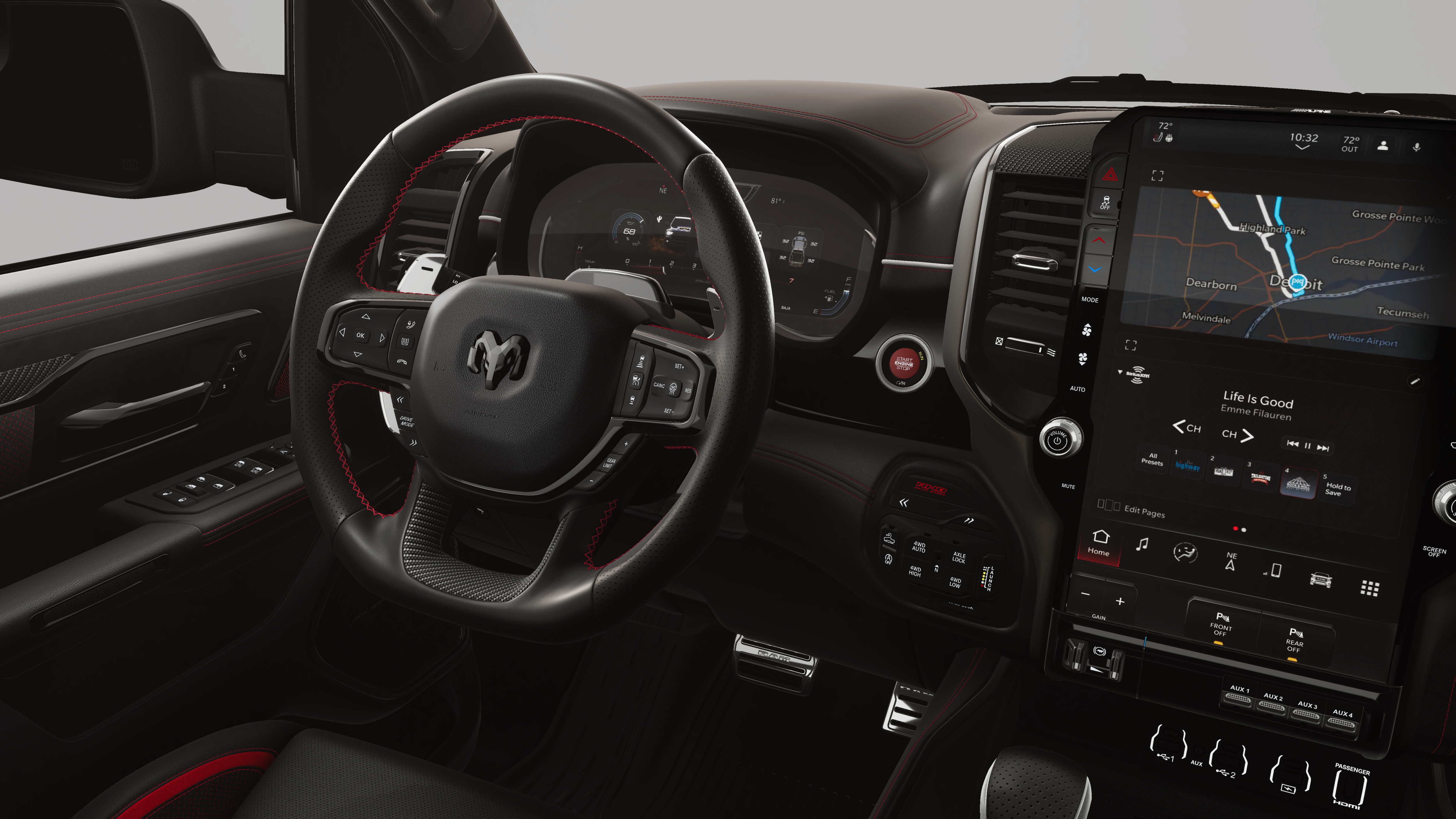 Quick Order Package 22Y RHO. RHO Level 1 Equipment Group: Full Length Premium Upgraded Floor Console; SiriusXM Radio Service; USB Host Flip; Surround View Camera System; Rain Sensitive Windshield Wipers; Integrated Center Stack Radio; LED CHMSL Lamp; Power Adjustable Pedals with Memory; Front Passenger Interactive Display; Integrated Voice Command with Bluetooth®; Connectivity - US/Canada; Traffic Sign Recognition; Digital 3.0 Rear View Auto Dim Mirror; GPS Navigation; 4G LTE Wi-Fi Hot Spot; Hands-Free Active Driving Assist System; Front Passenger Power Seat Back Massage; Head Up Display; Connected Travel and Traffic Services; Evasive Steer Assist; Heated Second Row Seats; Drowsy Driver Detection; Driver Power Seat Back Massage; Intersection Collision Assist System; Disassociated Touchscreen Display; Leather/carbon Flat-Bottom Steering Wheel; HD Radio; Smartphone as a Key Capable; 14.4" Touchscreen Display; Driver/passenger Wrapped Assist Handles; Dual Wireless Charging Pad; Uconnect 5 Nav with 14.4" Display; Ventilated Rear Seats; Rear 60/40 Folding Split Recline Seat; 240 Amp Alternator; Ventilated Front Seats; Harman/kardon 19 Speaker Premium Sound; Premium Wrapped Instrument Panel Bezel; Exterior Mirrors with Memory; Luxury Front Door Trim Panel; Real Carbon Fiber Interior Accents; Driver Seat Memory; Power Tailgate; Radio/driver Seat/mirrors/pedals Memory; 12-Way/1-way Trailer Connector; Full Length Premium Upgraded Floor Console; SiriusXM Radio Service; USB Host Flip; Surround View Camera System; Rain Sensitive Windshield Wipers; Integrated Center Stack Radio; LED CHMSL Lamp; Power Adjustable Pedals with Memory; Front Passenger Interactive Display; Integrated Voice Command with Bluetooth®; Connectivity - US/Canada; Traffic Sign Recognition; GPS Navigation; 4G LTE Wi-Fi Hot Spot; Hands-Free Active Driving Assist System; Front Passenger Power Seat Back Massage; Head Up Display; Connected Travel and Traffic Services; Evasive Steer Assist; Heated Second Row Seats; Drowsy Driver Detection; Driver Power Seat Back Massage; Intersection Collision Assist System; Disassociated Touchscreen Display; Leather/carbon Flat-Bottom Steering Wheel; HD Radio; Smartphone as a Key Capable; 14.4" Touchscreen Display; Driver/passenger Wrapped Assist Handles; Dual Wireless Charging Pad; Uconnect 5 Nav with 14.4" Display; Ventilated Rear Seats; Rear 60/40 Folding Split Recline Seat; 240 Amp Alternator; Ventilated Front Seats; Harman/kardon 19 Speaker Premium Sound; Premium Wrapped Instrument Panel Bezel; Exterior Mirrors with Memory; Luxury Front Door Trim Panel; Real Carbon Fiber Interior Accents; Driver Seat Memory; Power Tailgate; Radio/driver Seat/mirrors/pedals Memory; Digital Rearview Mirror; 12-Way/1-way Trailer Connector. 18" X 9" Bead-Lock Aluminum Wheels. Dual-Pane Panoramic Sunroof. Red Interior Accents. MOPAR Off-Road Style Running Boards. MOPAR RHO Hood Graphics. MOPAR RHO Exterior Graphics. Forged Blue Metallic. **Equipment listed is based on original vehicle build and subject to change. Please confirm the accuracy of the included equipment by calling the dealer prior to purchase.**